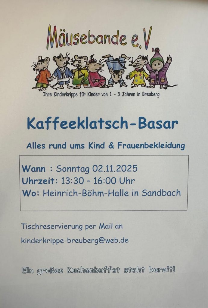 Die Mäusebande e.V. lädt herzlich zum Kaffeeklatsch-Basar ein! Unter dem Motto „Alles rund ums Kind & Frauenbekleidung“ findet am Sonntag, den 02.11.2025, von 13:30 bis 16:00 Uhr in der Heinrich-Böhm-Halle in Sandbach unser gemütlicher Basar statt.